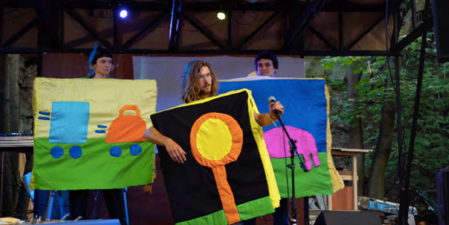 James Bazard est une peinture voyageuse qui parcourt le monde en chantant. Ce soir, il présente sur scène ses doutes, ses chants intimes, ses aspirations comme ses inspirations. Pourquoi décider d’être peinture quand on peut être humain ? Cette performance de 30 minutes fait lien avec la vidéo présentée dans l’exposition. James Bazard est imaginé par Pauline Rouet, Gauthier Andrieux-Chéradame et Félix Vayssade.